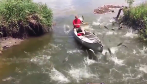 Check out this canoeist paddling in a quite area and gets all of a sudden hundreds of fishing jumping around, [&hellip