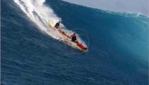 Loch Eggers and Dave Kalama surfing Jaws with an outtrigger. Insane! Photo credit: Darell Wong